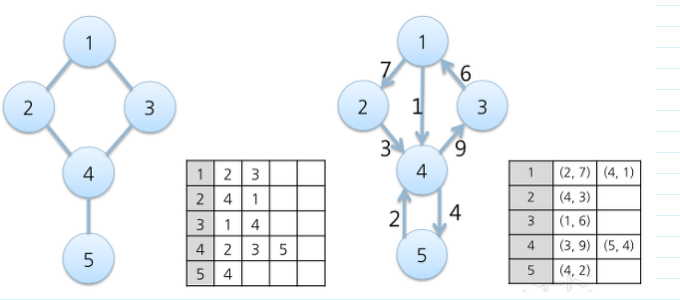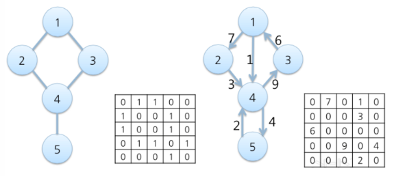 첫번째는 무방향 그래프이고, 두번째는 방향 그래프(가중치 그래프)